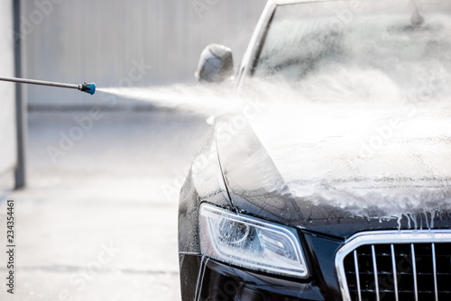 Close Up Of A Car Under The Water Jet During The Washing Process
